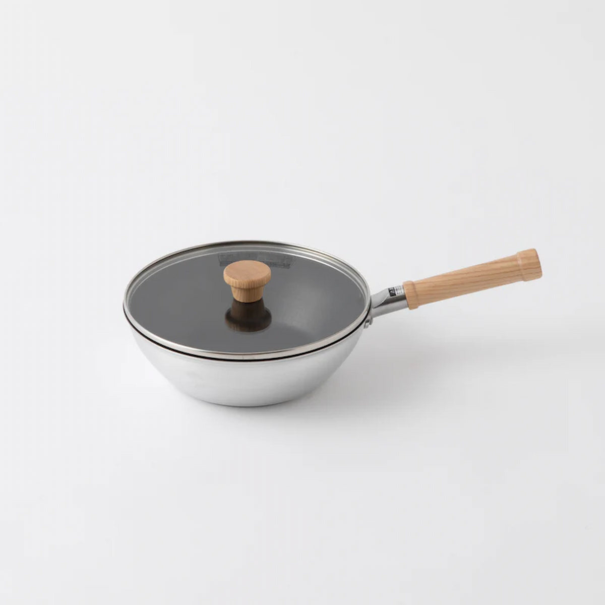上品なマット仕上げのアルミボディに、天然木の華奢なハンドル。ガラス蓋には木製のつまみを合わせ、ナチュラルで落ち着いた雰囲気を演出します。シンプルでスタイリッシュな佇まいは、使わないときもキッチンにそっと馴染み、置いておくだけで絵になる存在です。