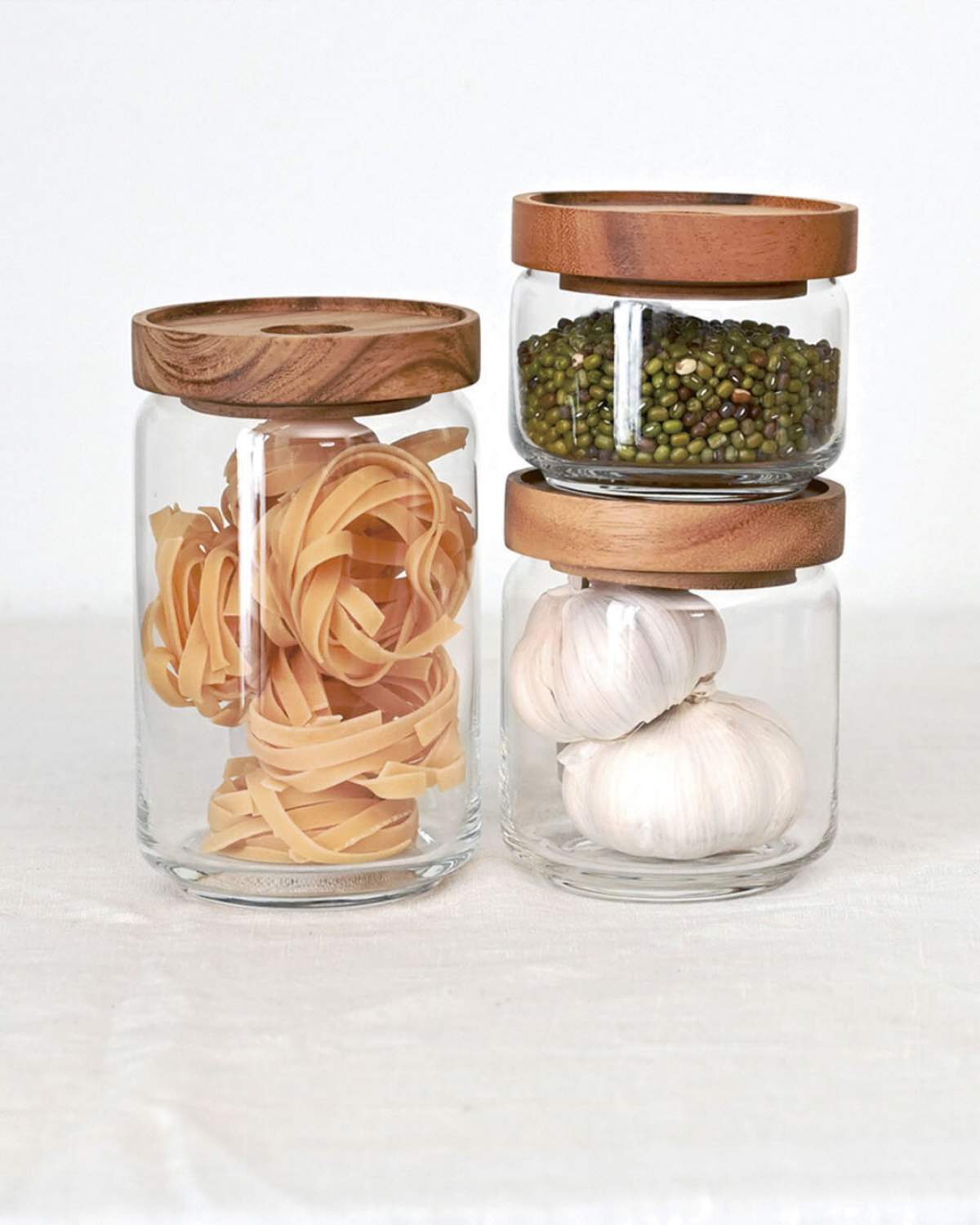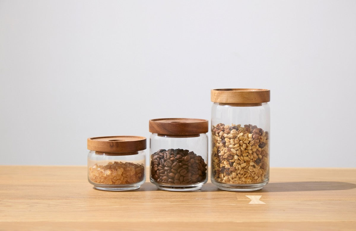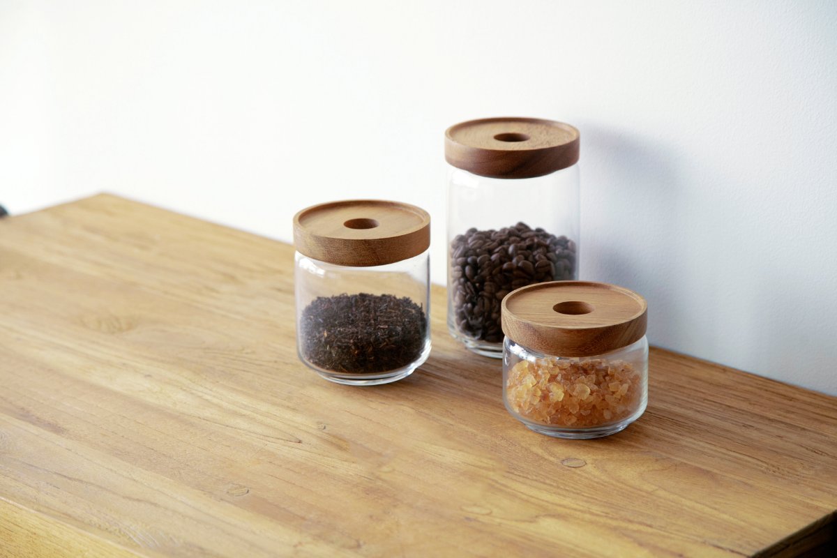 透明なガラスと天然木の蓋が織りなすナチュラルな佇まい。置くだけでキッチンを上質な空間へと導きます。